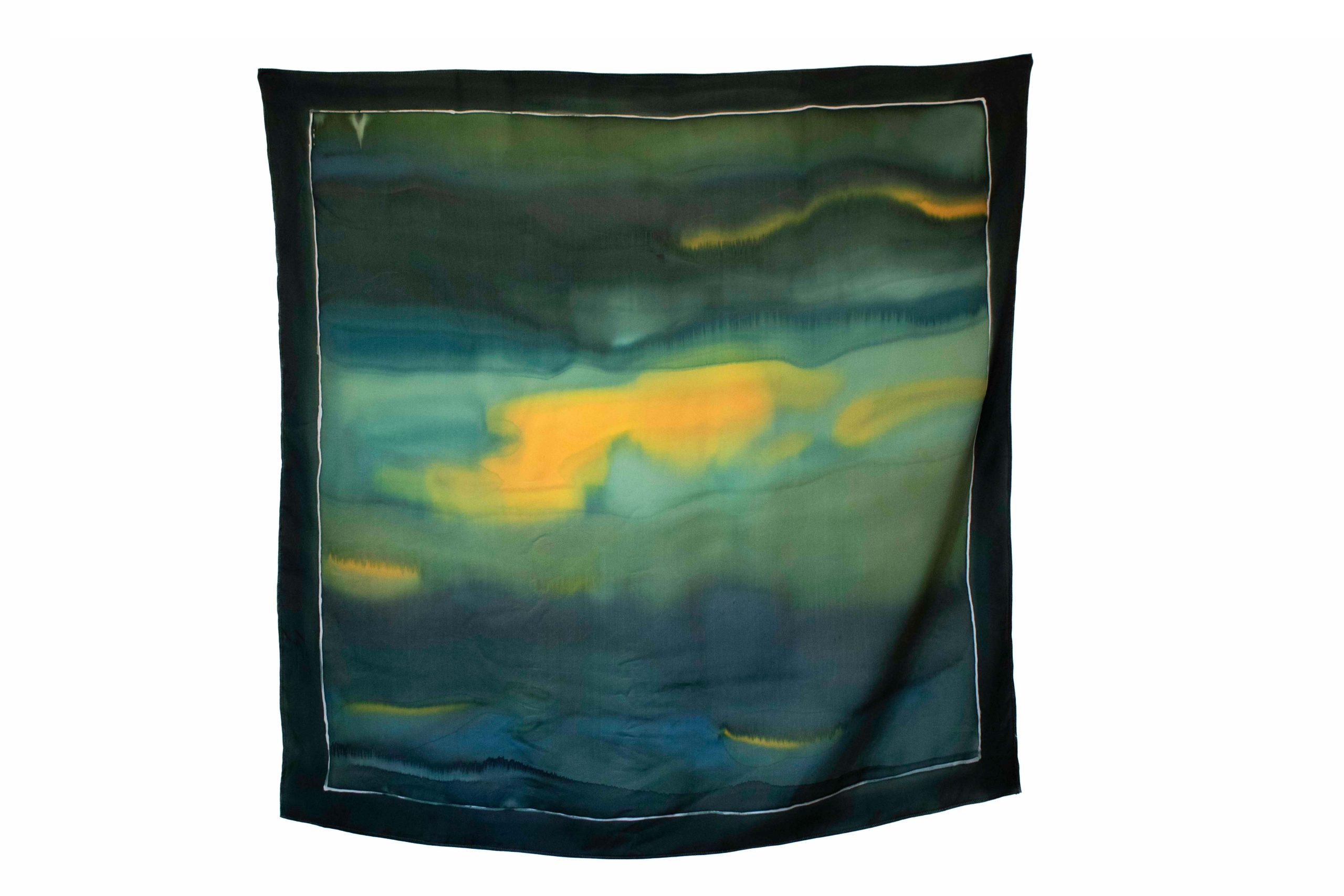 Esmerald Storm was painted with professional non-toxic silk dyes, then steam-set to preserve its vibrancy and softness. Its smooth texture and luminous finish make it a refined accessory for everyday elegance or special occasions.